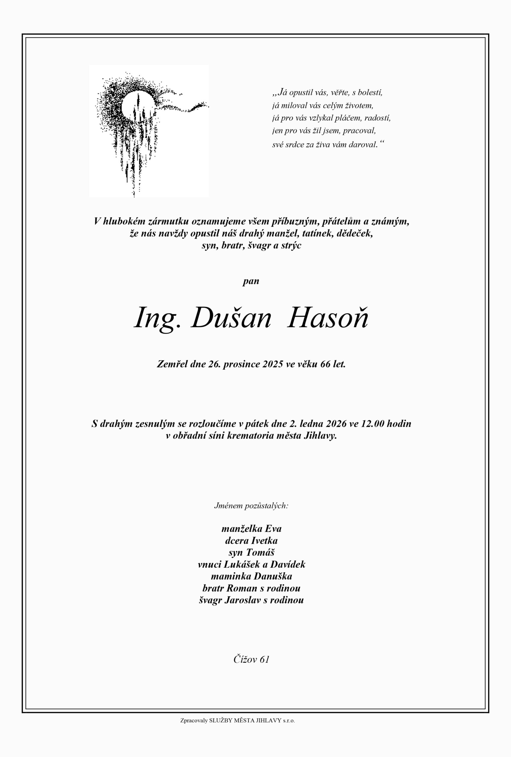 S hlubokým zármutkem oznamujeme, že dne 26. 12. 2025 nás navždy opustil náš dlouholetý ředitel pan Ing. Dušan Hasoň.